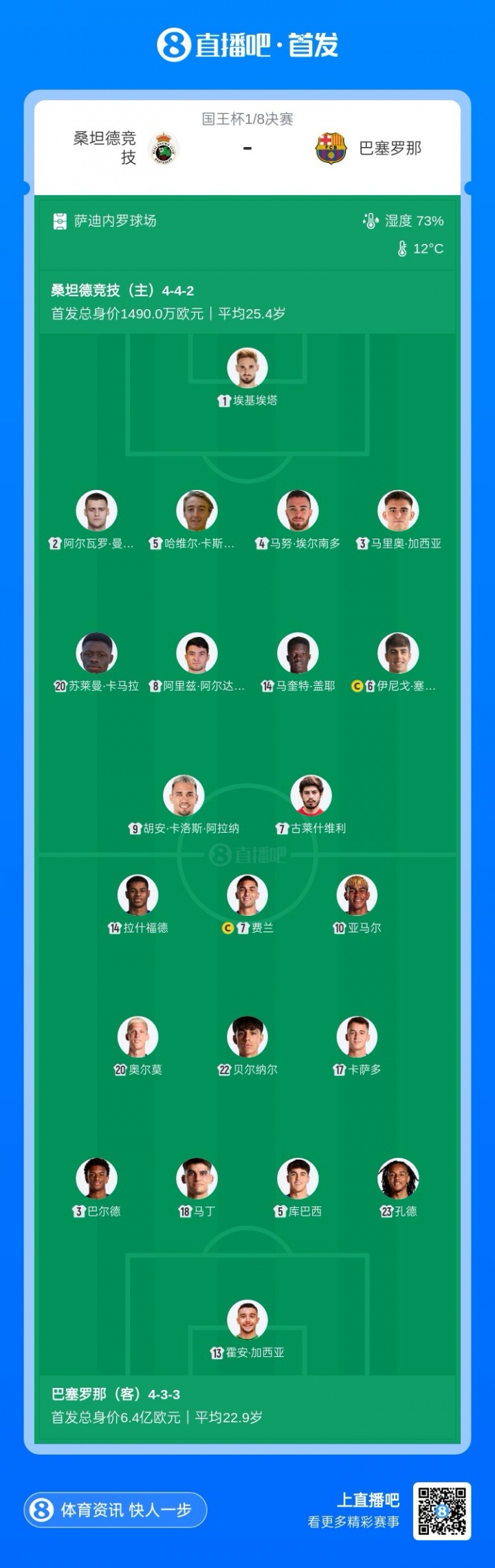 今天没意外吧?巴萨杆位总身价6.4亿欧,桑坦德竞赛 杆位1490万欧