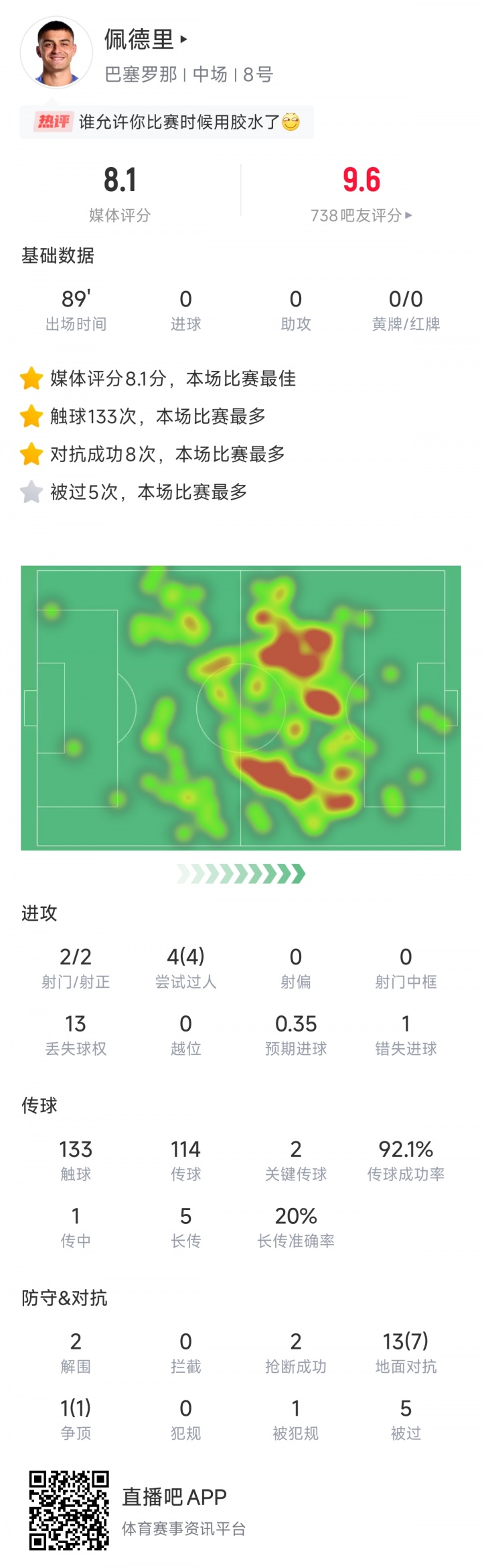 佩德里本场赛事 依旧是贡献极为逆天的数据。133次触球冠绝全场,这其中他有4次过人全部成功,14次对峙 8次成功,114次传送球 92.1%成功率,免费欧洲杯直播2关键传送球 2解围2抄截 。5次被过是他唯一的弱势数据。热点图覆盖整个中场球员的佩德里,已成巴萨不可或缺的发动机。