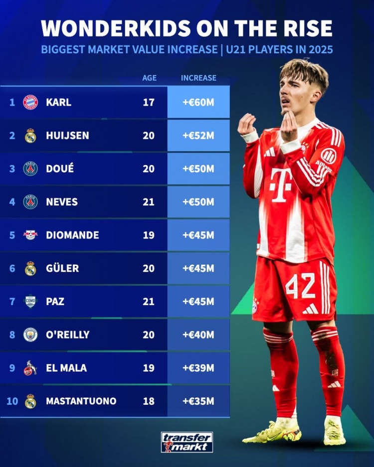 1月4日讯 《转会市场》统计了2025年U21球员的身价上涨幅度情况,拜仁小将卡尔位居榜首。