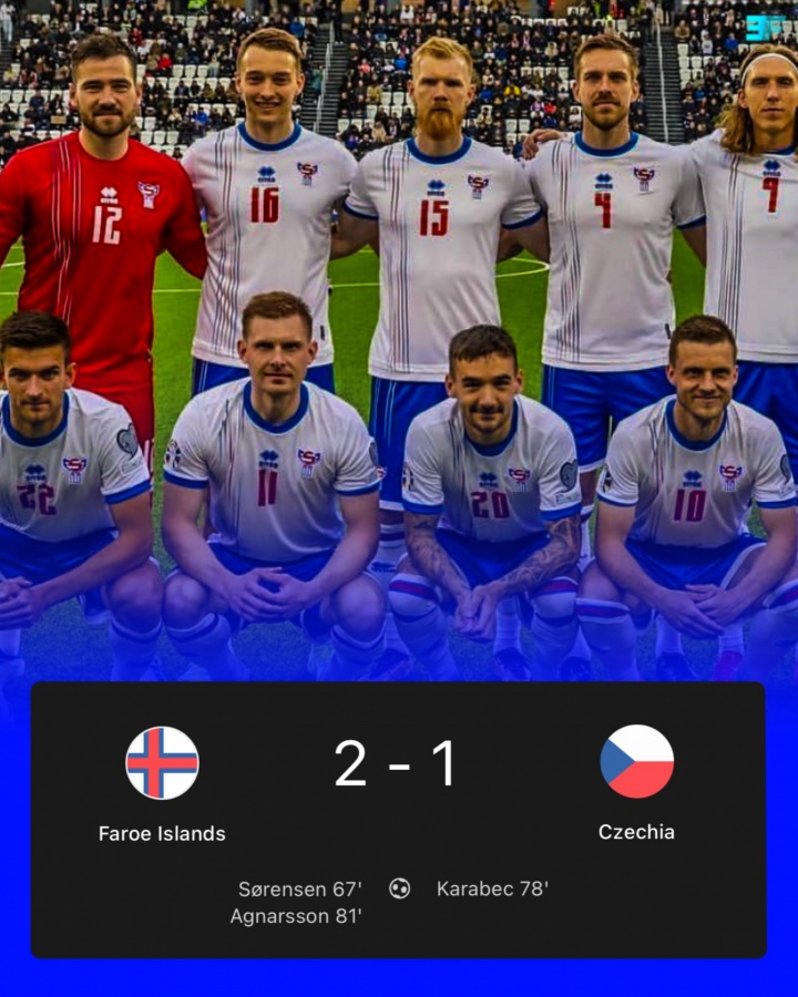 世预赛欧洲区小组赛,世界排名第136的法罗群岛在主场作战 以2-1的比分爆冷战胜世界第39的捷克。