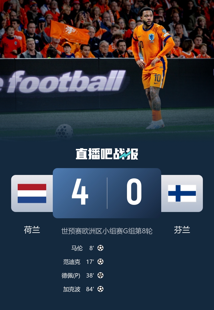 德佩点射+助功 双响,马伦世界波,范迪克、加克波建功;荷兰6轮不败领跑G组。